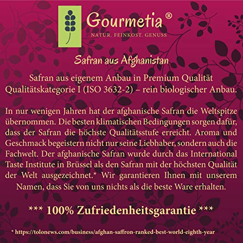 Saffraandraad van premium kwaliteit van ISO categorie I (ISO 3632-2). Onze saffraandraden komen uit het beroemde Chorasan saffraanteelt gebied in West-Afghanistan. De beste klimatologische omstandigheden zorgen voor een bijzondere dieprode kleur en een uniek aroma. Wij bij Gourmetia, een familie bedrijf dat 100% in eigen beheer is, oogsten onze saffraan uit onze eigen teelt. Bij Gourmetia beheren wij het hele proces van kwaliteitsborging van vóór de teelt, tijdens de teelt, tijdens het oogsten, tijdens het verpakken en de verkoop met de grootste zorg. Afghaanse saffraan wordt door het International Taste and Quality Institute erkend als de hoogste kwaliteit saffraan ter wereld. Met onze naam garanderen wij dat u alleen de beste goederen van ons ontvangt. Analysewaarden 2019/20 – Crocin (kleur): 284,3 – Safranal (geur): 34,2 – Picrocrocin (smaak) 89,1